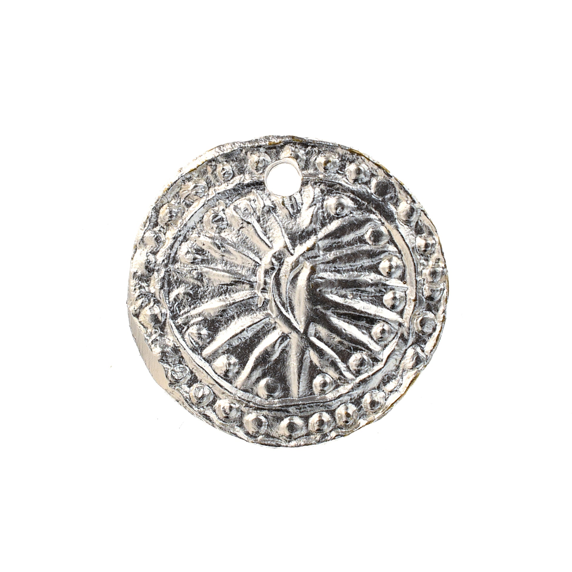 A Funan Kingdom coin pendant. Each pendant measures 30mm in diameter with a 3mm hole and weighs 6.5 grams. Silver plated brass. Cast in Bali, Indonesia.