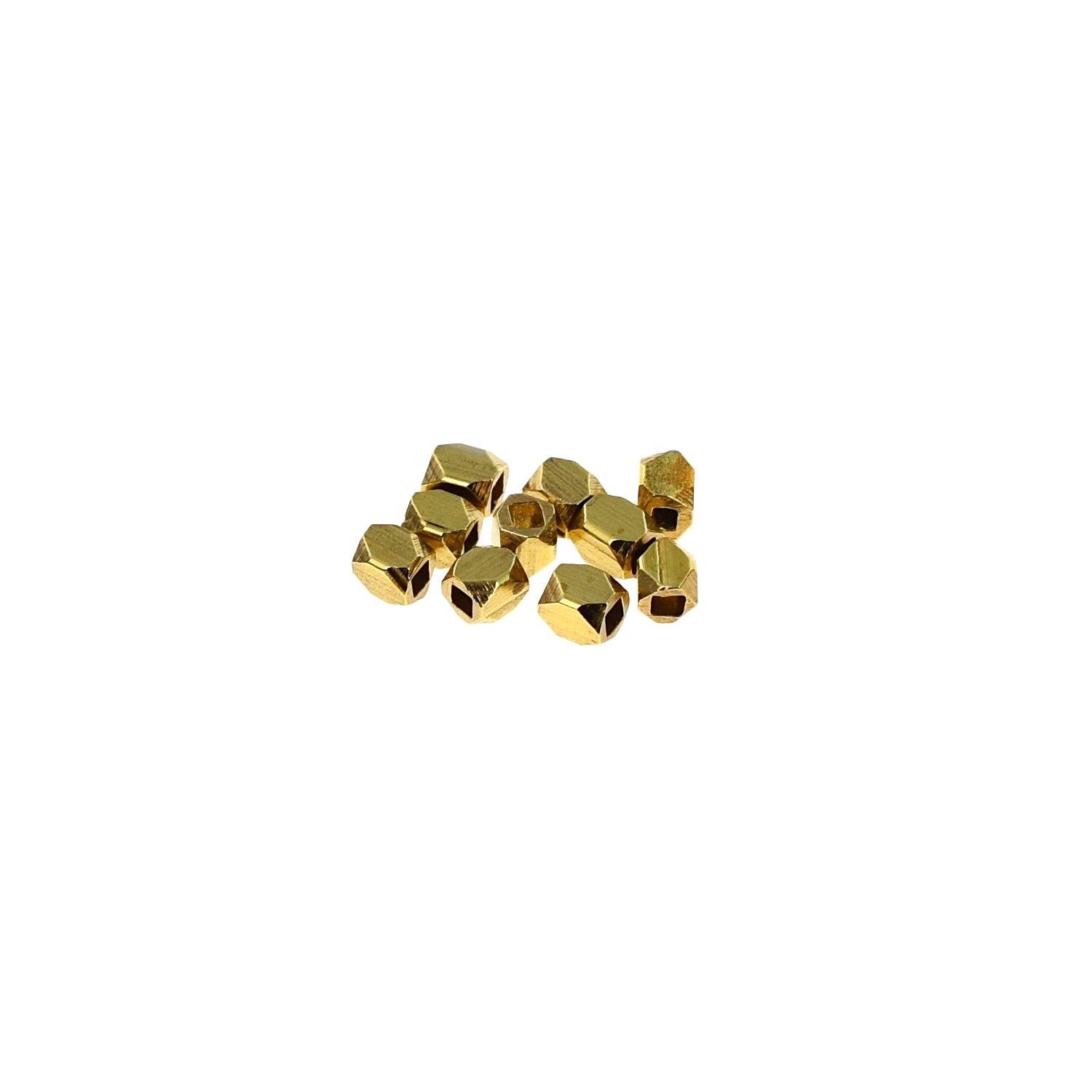 A small faceted square spacer bead. Each bead measures 2mm wide by 2.5mm long with a 1mm center hole. Brass with optional silver or gold plate finish. Hand crafted in Bali, Indonesia.